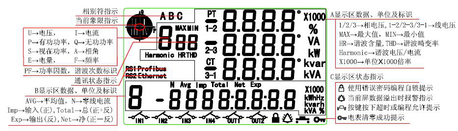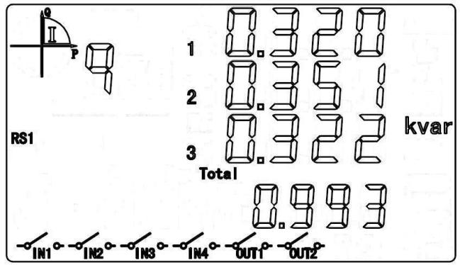 循顯模式下,按“▲”或“▼”鍵進入按顯模式。選定A區時,按“▲”或“▼”鍵切換至無功功率顯示項,圖中數據為:L1=0.320kvar,L2=0.351kvar,L3=0.322kvar,總無功功率=0.993kvar。