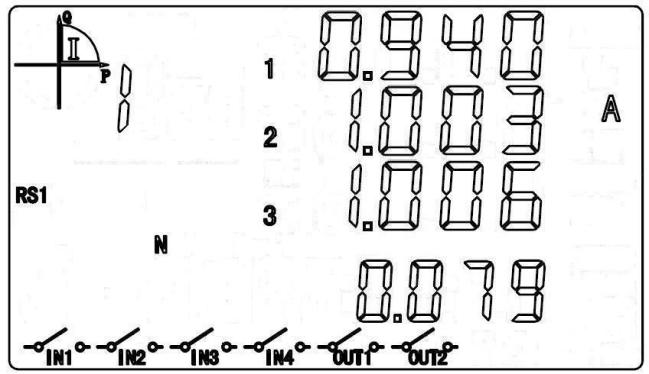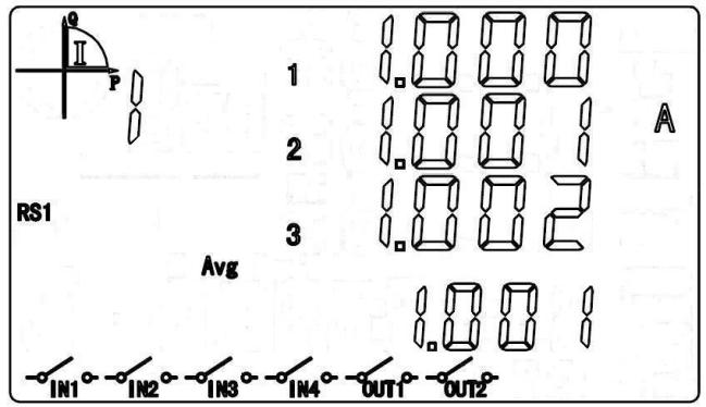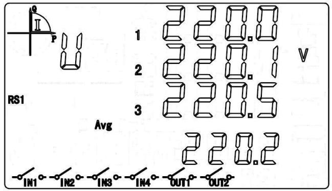 循顯模式下,按“▲”或“▼”鍵進入按顯模式。選定A區時,按“▲”或“▼”鍵切換至相電壓顯示項。圖中數據為:L1=220.0V,L2=220.1V, L3=220.5V,三相平均電壓=220.2V。 “RS1”提示有一路RS485口,若符號閃爍表示正在進行通信中;“