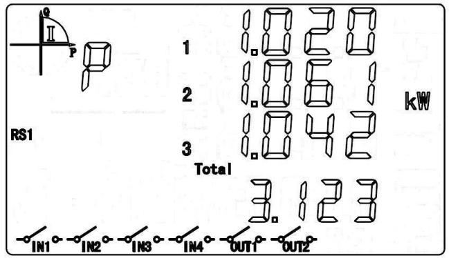 循顯模式下,按“▲”或“▼”鍵進入按顯模式。選定A區時,按“▲”或“▼”鍵切換至有功功率顯示項,圖中數據為:L1=1.020kW,L2=1.061kW,L3=1.042kW,總有功功率=3.123kW。