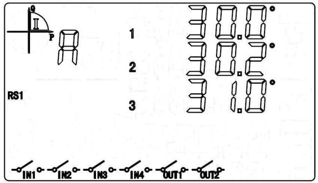 循顯模式下,按“▲”或“▼”鍵進入按顯模式。選定A區時,按“▲”或“▼”鍵切換至相角顯示項,圖中數據為:L1=30.0°,L2=30.2°,L3=31.0°。
